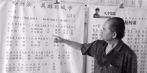張智深在與李敏共同創(chuàng)作的《哈爾濱,英雄的城市》歌曲前合影。