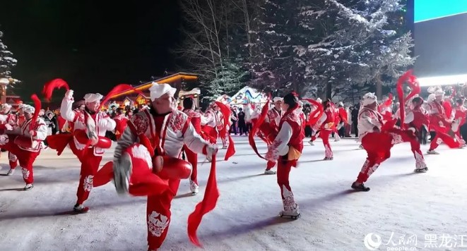 隨著夜幕降臨,一陣激昂而富有節(jié)奏感的鼓點(diǎn)響起,來自陜西的安塞腰鼓演員們身著艷麗的陜西傳統(tǒng)民俗服飾,腰系紅鼓,帶著陜北風(fēng)情,從黃土高原走進(jìn)童話雪鄉(xiāng)。演員們身姿矯健,用力揮槌踢腿、轉(zhuǎn)身跳躍,動(dòng)作整齊劃一,隊(duì)形靈活多變,令人目不暇接。火紅的服裝與周圍的雪景形成了鮮明對(duì)比,仿佛是冬日里的一抹火焰,吸引著四面八方的游客匯聚而來。